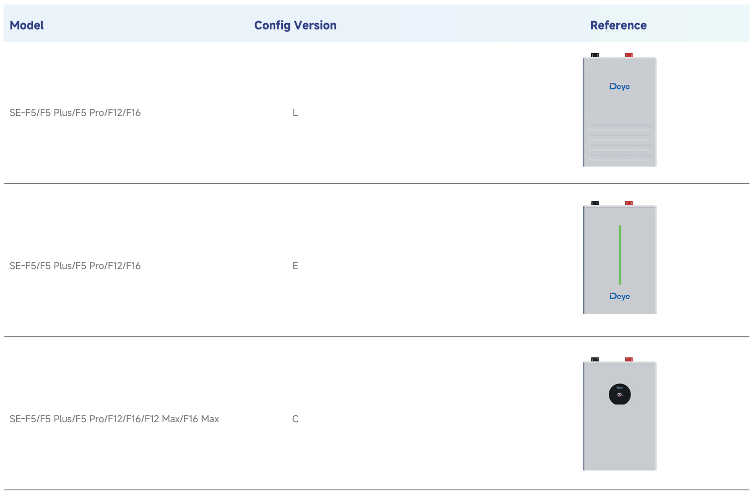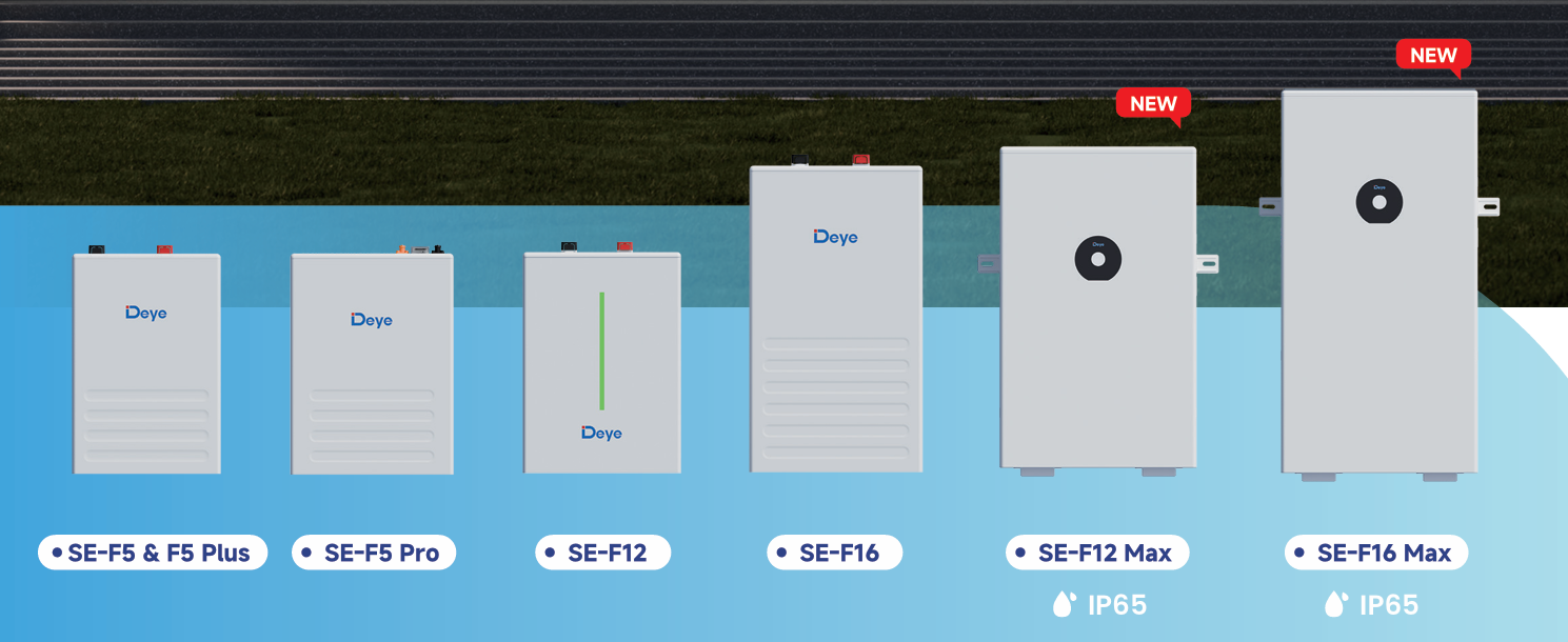 Všetky modely SE-F využívajú chémiu LFP a komunikujú cez CAN 2.0 a RS485. Každý balík podporuje paralelné rozšírenie; V brožúre spoločnosti Deye je štandardne špecifikovaných až 32 paralelných jednotiek, pričom väčšie počty paralelných jednotiek sú znázornené pomocou mosta CAN (stále platia dizajn systému a miestne schválenia).