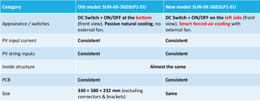 Prechod zo starého modelu (SUN-6K-SG03LP1-EU) na nový model (SUN-6K-SG05LP1-EU) odráža vylepšenia v oblasti chladenia a dizajnu používateľského rozhrania s pridaným chladením s núteným obehom vzduchu a dostupnejším rozložením spínačov. Tieto zmeny zvyšujú výkon a jednoduchosť používania meniča. Inštalatéri však musia vziať do úvahy potenciálny vplyv hluku z nového externého ventilátora a zabezpečiť správnu vzdialenosť pre efektívne prúdenie vzduchu. Hlavné elektrické komponenty a rozmery zostávajú do značnej miery nezmenené, čo zaisťuje kontinuitu a kompatibilitu v inštaláciách.